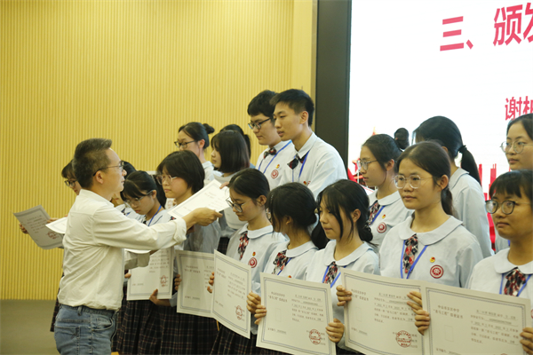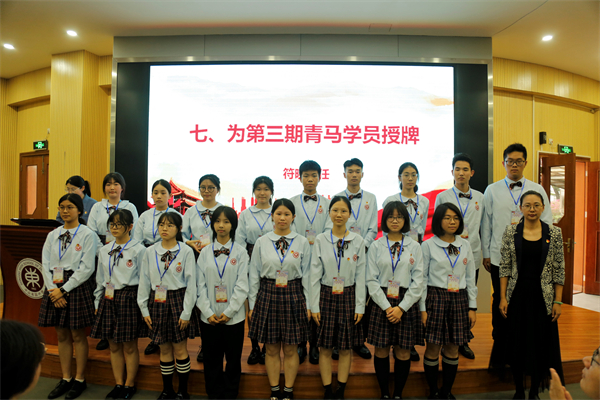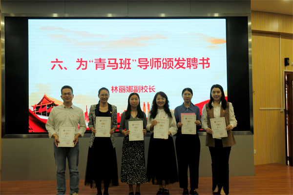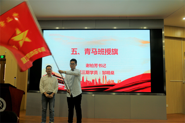 接著,謝柏芳書記為青馬班授旗。青馬紅旗在鄒明燊同學手中揮舞。這鮮紅的旗幟將會成為新一期青馬學員靚麗青春里一抹鮮亮的底色。隨后,林麗娜副校長分別為導師頒發(fā)聘書,德育處符曉主任為第三期青馬學員授牌。聘書和學員證的頒發(fā),意味著新一期青馬工程的正式開啟。希望青馬學員們能夠在優(yōu)秀黨員教師的身上學習黨史、學習科學理論知識,學習他們身上愛黨敬業(yè)的優(yōu)良品質。
