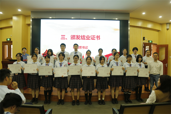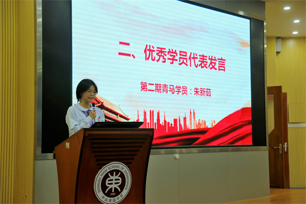 儀式在雄壯的國歌聲中拉開了序幕,全體與會人員齊唱國歌,一起用嘹亮的國歌聲歡慶青馬工程的接續(xù)啟動。隨后,優(yōu)秀學員代表朱新茹同學分享了這一年她的學習體會。第二期青馬學員經(jīng)過扎實的理論學習,豐富的研學活動和相應的志愿服務后,全部圓滿完成學習任務,順利結業(yè)。接下來,黨總支謝柏芳書記為他們頒發(fā)結業(yè)證書,并由林麗娜副校長致辭。