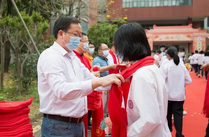 下午兩點四十分,高三學子整肅在學校廣場,分班依次穿過“成人門”,走上紅地毯。全體高三老師列隊兩側,雙手為剛剛跨過成人門檻的學子們披上紅色圍巾,歡送他們穿越“成功門”,登上“十八歲成人禮暨高考動員大會”的主會場。
