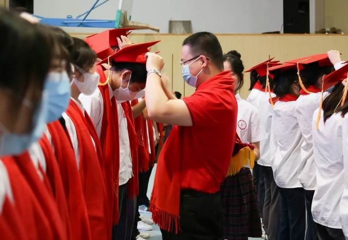 周錦泉校長,張旭副校長帶領班主任為學生佩戴成人帽、頒發(fā)《中華人民共和國憲法》讀本。成人是一種超越生命時間尺度的責任與擔當。頭戴成人帽,手捧《憲法》,這一刻他們已是肩負責任與使命的成人了,寓意著同學們要以共和國公民的身份去承擔起法律賦予的權利和義務!同學們要用一往無前的勇氣去面對高考,面對未來的人生。