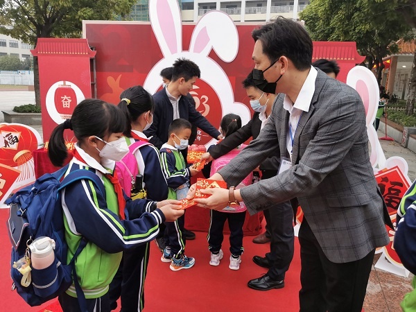 春風(fēng)十里,不如校園有你。2月6日上午,懷著對新學(xué)期的美好期待,羅松小學(xué)學(xué)子開心步入闊別兩個月的美麗校園。為更好迎接同學(xué)們歸來,學(xué)校開展了以“感受傳統(tǒng)文化,喜迎癸卯兔年”為主題的歡迎儀式,儀式設(shè)計兔年主題展臺,展臺兩邊是雙兔拜年,中間放置充滿粵式諧音祝福的果蔬禮品,寓意聰明、勤懇、平安等,寄托對同學(xué)們的深深祝福,同時安排六位舞獅少年,頭頂獅子,分置走道兩側(cè),醒獅開門,為同學(xué)們鼓舞斗志。學(xué)校還用心為每位同學(xué)準(zhǔn)備了一份寫滿新春寄語的特殊紅包,包含著羅松小學(xué)老師們的一份份殷切祝福和期望,激勵同學(xué)們以昂揚(yáng)斗志,滿懷激情投入到新學(xué)期的學(xué)習(xí)中去。