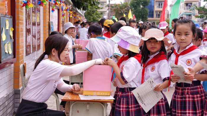 早上,群眾小學(xué)舉行了“喜迎二十大 爭做好隊員”活動。梁銓華校長向全校少年兒童送上節(jié)日祝福。在學(xué)校雛鷹合唱團(tuán)的帶領(lǐng)下,全校師生共同唱響《我們健康快樂成長》以及《一起向未來》。緊接著,六(3)班少先隊員李青璇帶來一曲歡快的古箏獨奏。表演結(jié)束后,群眾社區(qū)陳淑媚委員和吳芳委員親自給孩子們送上節(jié)日禮物。