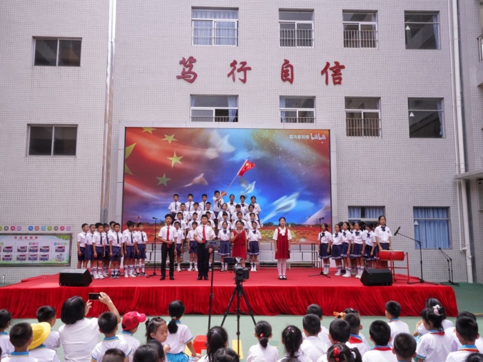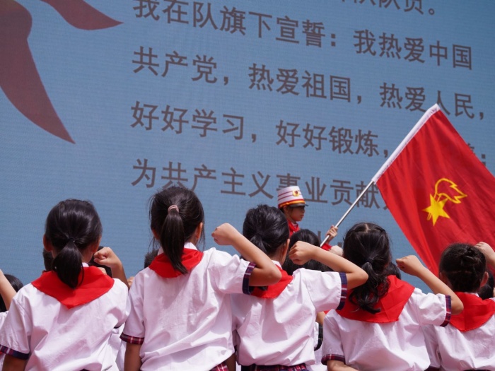 這一天對于一年級的同學(xué)們來說是個特別的日子。因為在這天,又有一批新的少先隊員加入到中國少年先鋒隊的行列。高年級的哥哥姐姐們作為隊員,為一年級的新隊員們佩戴了鮮艷的紅領(lǐng)巾。新隊員們在鮮艷紅領(lǐng)巾的映襯下,綻放出甜甜的微笑。
