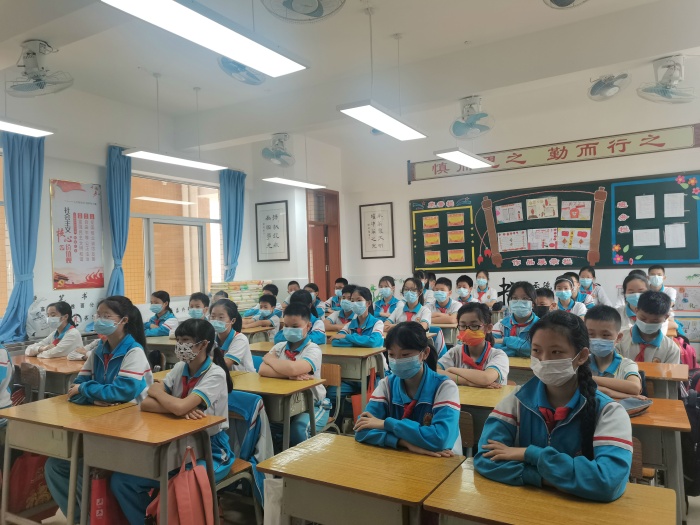 接著模擬演練場(chǎng)景二,上午上課期間某班一名學(xué)生感覺(jué)身體不舒服舉手向老師示意。老師詢問(wèn)情況得知這位同學(xué)出現(xiàn)發(fā)熱、嘔吐等癥狀,且該生爸爸近14天曾到過(guò)中高風(fēng)險(xiǎn)地區(qū)。班主任立馬向?qū)W校匯報(bào)并聯(lián)系保健老師。學(xué)校通知清潔阿姨來(lái)教室進(jìn)行清潔消毒。校長(zhǎng)馬上啟動(dòng)應(yīng)急預(yù)案,指揮學(xué)校開(kāi)展應(yīng)急處置工作,啟動(dòng)校園封閉管理。