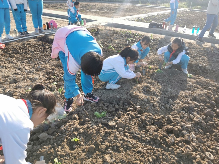 到了勞動(dòng)教育基地,隊(duì)員們先認(rèn)真聆聽(tīng)郭主任講解翻地、種植、澆水的方法和注意事項(xiàng),接著輔導(dǎo)員示范如何翻地、種植和澆水。認(rèn)真學(xué)習(xí)好要領(lǐng)后,少先隊(duì)員們躍躍欲試,分小組在各自的“責(zé)任地”里忙得不亦樂(lè)乎:奮力揮舞著手中的鋤頭翻地;擼起袖子彎腰種菜;給菜地澆水……大家忙碌著,享受著勞動(dòng)的快樂(lè)。不一會(huì),一塊塊田地里種上了一排排整齊的菜苗。隊(duì)員們看著自己的勞動(dòng)成果,露出了會(huì)心的微笑。