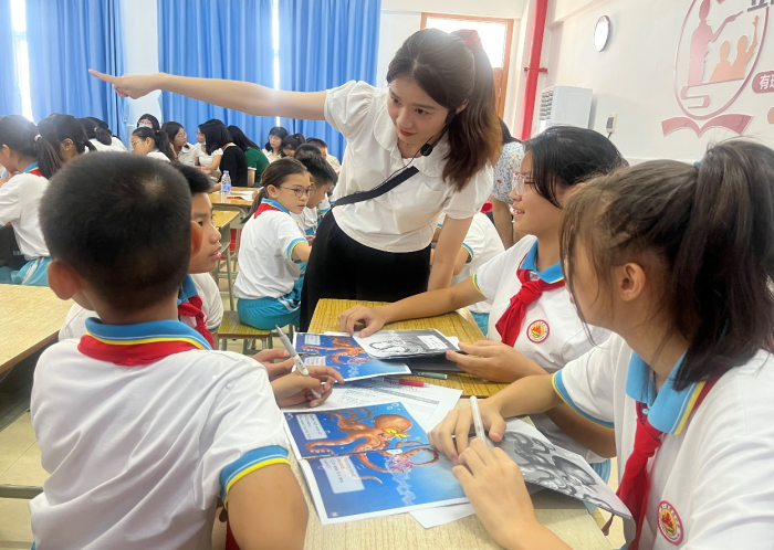 接著,港口鎮(zhèn)小學(xué)英語教研組長蔡東琳老師進(jìn)行優(yōu)秀繪本課例展示,與港口鎮(zhèn)群眾小學(xué)六年級的學(xué)生共同呈現(xiàn)了一節(jié)生動又高效的繪本閱讀課例——“Octopus is a friend”。蔡老師通過Free talk巧妙導(dǎo)入,從而激發(fā)學(xué)生的知識背景和學(xué)習(xí)動機(jī),再利用圖片環(huán)游的形式,幫助學(xué)生逐步深入理解故事內(nèi)容,引導(dǎo)學(xué)生感悟故事內(nèi)涵。本節(jié)課例教學(xué)目標(biāo)明確,條理清晰,層次分明,多維度地培養(yǎng)了學(xué)生的英語學(xué)科核心素養(yǎng)。