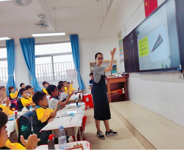 漢字筆畫(huà)的形態(tài)變化對(duì)于小學(xué)生來(lái)說(shuō)是一大難點(diǎn)。但是何老師化繁為簡(jiǎn),先用手勢(shì)操深入淺出地引導(dǎo)同學(xué)們理解短撇的形態(tài),再通過(guò)“永字八法”小視頻里的“短撇為啄”引導(dǎo)大家感受短撇的力量感。
