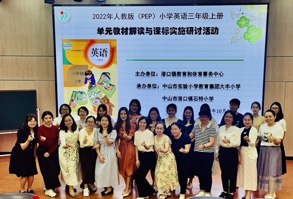 為不斷提升小學英語教師整體把握新課程標準,落實學科核心素養(yǎng),深度解讀教材,整合單元教材資源,促進教師專業(yè)發(fā)展。2022年10月27日,在中山市港口鎮(zhèn)教育和體育事務中心的高度統(tǒng)籌下,中山市港口鎮(zhèn)石特小學英語科組聯(lián)合兄弟學校中山市實驗小學教育集團大豐小學英語科組共同承辦2022年人教版(PEP)小學英語三年級上冊第三單元教材解讀與課標實施研討活動。港口鎮(zhèn)教育和體育事務中心教研專干吳濤濤老師、港口鎮(zhèn)小學英語中心教研組組長蔡東琳老師蒞臨指導,各兄弟學校的英語老師參加了本次活動。