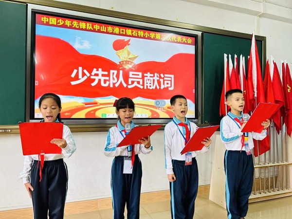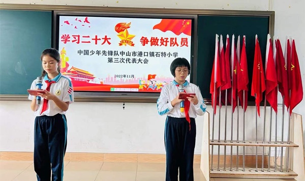 為深入學(xué)習(xí)貫徹黨的二十大精神,增強(qiáng)少先隊(duì)員的光榮感和歸屬感,教育引導(dǎo)少先隊(duì)員們從小學(xué)先鋒,長大做先鋒,聽黨話、跟黨走、讓紅領(lǐng)巾更鮮艷。11月21日下午,港口鎮(zhèn)石特小學(xué)迎來了中國少年先鋒隊(duì)港口鎮(zhèn)石特小學(xué)第三次少先隊(duì)員代表大會。港口鎮(zhèn)團(tuán)委副書記胡俊輝、石特小學(xué)校長蘇少麗、德育處主任唐慧、輔導(dǎo)員代表、教師代表及少先隊(duì)員代表參加了本次大會,共同見證了這個莊嚴(yán)而有意義的時刻。