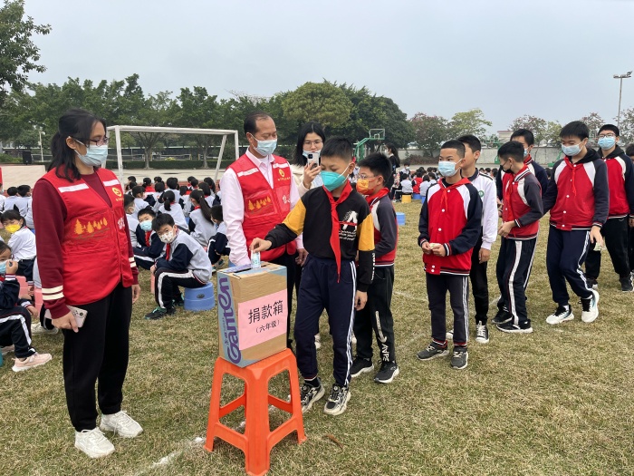 大愛(ài)無(wú)邊,慈善同行。典禮的最后環(huán)節(jié)是慈善萬(wàn)人行活動(dòng),在《我們與愛(ài)同行》的背景音樂(lè)中,每個(gè)年級(jí)的同學(xué)有序地排好隊(duì)伍,紛紛獻(xiàn)上自己的一份愛(ài)心。