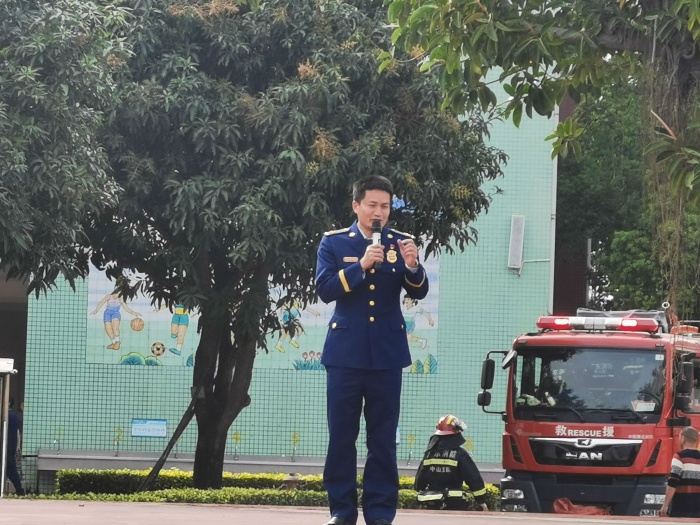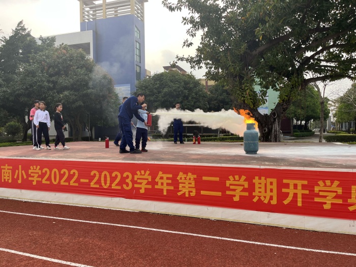 緊接著港口鎮(zhèn)消防大隊給全體師生員工做消防安全教育,對大家講了一些基本的消防安全知識及自救自護方法。消防員大隊還在操場進行實操演練環(huán)節(jié),隊員們嫻熟地向全體師生演示對著火點進行現(xiàn)場的應(yīng)急處置,和演示消防車的滅火以及搶救被困人員過程。消防員叔叔們專業(yè)規(guī)范的操作贏得全體師生一陣陣熱烈的掌聲。他們還向同學(xué)們講解如何正確使用滅火器,教我們“一拔、二提、三扶、四按”的口訣,并向我們示范如何使用滅火器。教師代表和學(xué)校保安根據(jù)消防員同志講解的滅火操作步驟進行了滅火演練,親自體驗滅火器的使用方法與技巧。