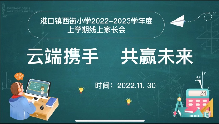 為加強(qiáng)家校溝通,提高線上教學(xué)的質(zhì)量,保障學(xué)生居家學(xué)習(xí)的身心健康發(fā)展,根據(jù)學(xué)校的工作安排,港口鎮(zhèn)西街小學(xué)于11月30日晚召開“云端攜手 共贏未來”線上家長(zhǎng)會(huì)。為了順利開好本次線上家長(zhǎng)會(huì),學(xué)校領(lǐng)導(dǎo)高度重視,根據(jù)上級(jí)各項(xiàng)疫情防控工作的相關(guān)通知,結(jié)合當(dāng)前疫情形勢(shì)以及學(xué)校的實(shí)際情況,做出了全面部署,統(tǒng)籌安排家長(zhǎng)會(huì)相關(guān)要點(diǎn),并對(duì)各班級(jí)提出了明確要求。