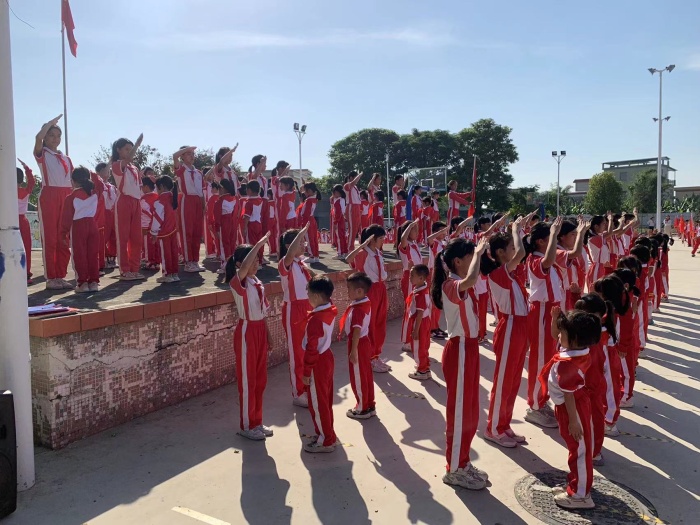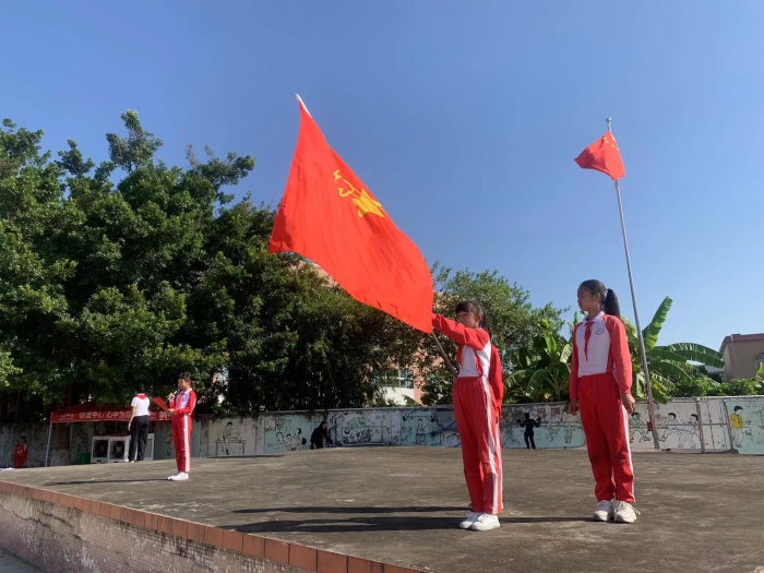 宣誓完畢后,校長丘茶芬為一年級兩個中隊授予隊旗。丘校長對新隊員們表示熱烈的祝賀,同時希望每位隊員都能夠銘記誓言,好好學(xué)習(xí),好好鍛煉,全面發(fā)展,當(dāng)好社會主義接班人。