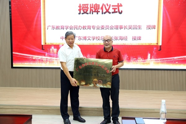 隨后是隆重的授牌儀式。吳回生理事長授予博文學(xué)?!皬V東省智慧課堂示范學(xué)?!迸曝遥┪膶W(xué)校校長張海經(jīng)鄭重接過牌匾并予以由衷感謝。