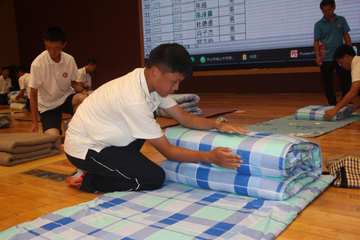 比賽活動采用現(xiàn)場隨機(jī)抽簽方式,選出每班 6名同學(xué)作為參賽代表,限時(shí)4分鐘完成。每組比賽結(jié)束后,宿舍生活老師對參賽同學(xué)的“成果”進(jìn)行打分。整個(gè)比賽過程緊張而激烈,參賽同學(xué)在場上爭分奪秒、不放過任何一點(diǎn)皺褶的地方,將被子疊得方方正正,就像軍訓(xùn)期間教官所說的疊成“豆腐塊”形狀。場下同學(xué)們的吶喊聲、加油聲此起彼伏。