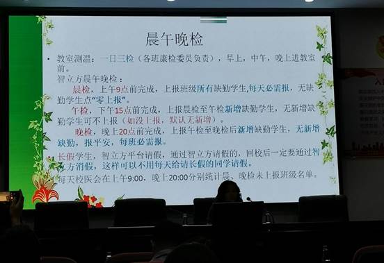 四位講座嘉賓分別從“校園防疫”“班級(jí)管理”“新生入學(xué)教育”“軍訓(xùn)安排”等四個(gè)方面進(jìn)行了分享。趙書芹校醫(yī)從晨午晚檢細(xì)則、學(xué)生因病請(qǐng)假返校流程、學(xué)生特殊情況就醫(yī)流程等三個(gè)方面,讓班主任和新教師有效了解現(xiàn)行校園疫情防控要求。同時(shí),提醒班主任要注意實(shí)時(shí)掌握學(xué)生的身體狀況,通過建立新生健康狀況調(diào)查表、設(shè)置教室物資箱等措施,切實(shí)提高班級(jí)防疫管理實(shí)效。