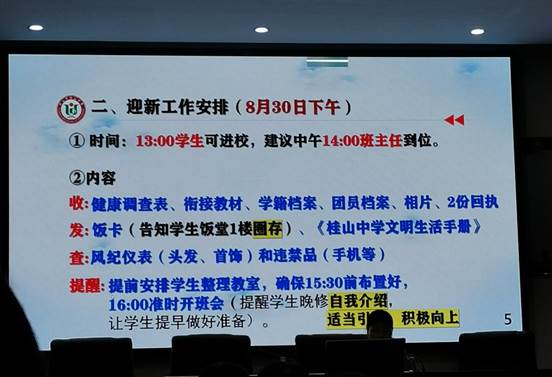 年級(jí)德育主任丁云志以“新班級(jí)組建及日常管理策略”為題,從“初建班級(jí)的五個(gè)關(guān)鍵方面”和“快速組建新班集體的措施”兩方面分享了有效管理班集體,讓班級(jí)在寬松又嚴(yán)格的氛圍下合理健康地發(fā)展的相關(guān)經(jīng)驗(yàn),為班主任日后的班級(jí)管理工作提供了很大幫助;張會(huì)芬級(jí)長進(jìn)行新生報(bào)到及入學(xué)教育安排解讀,細(xì)致闡述了迎新工作和入學(xué)教育的總體思路和具體實(shí)施,并指出迎新工作和入學(xué)教育的目的在于讓高一新生順利有序報(bào)到、盡快適應(yīng)高中的學(xué)習(xí)和生活,為日后成為“人生自信、品德自礪、學(xué)習(xí)自主、言行自律、生活自理”的優(yōu)秀桂山學(xué)子奠定基石,深化了班主任對(duì)校園迎新工作的認(rèn)識(shí)。