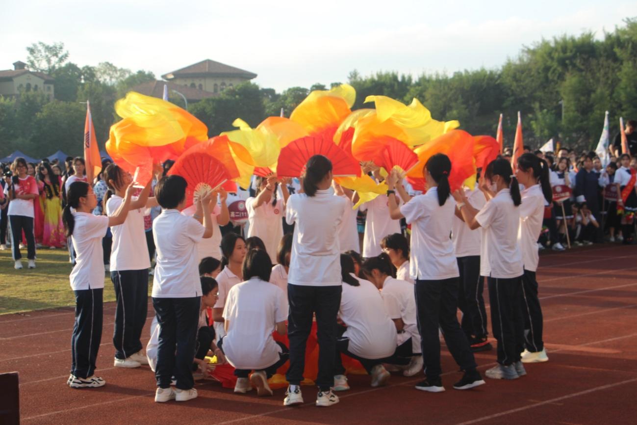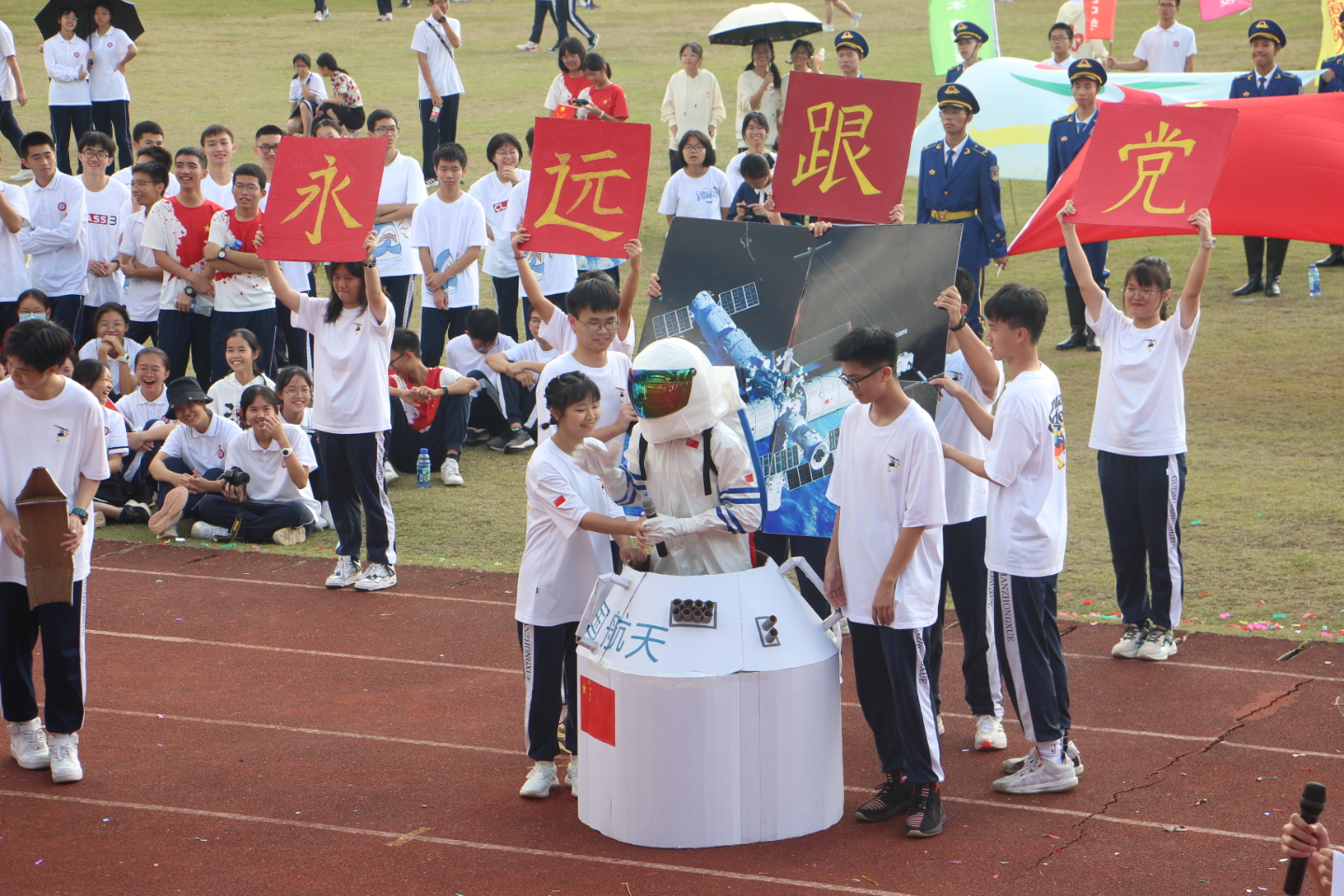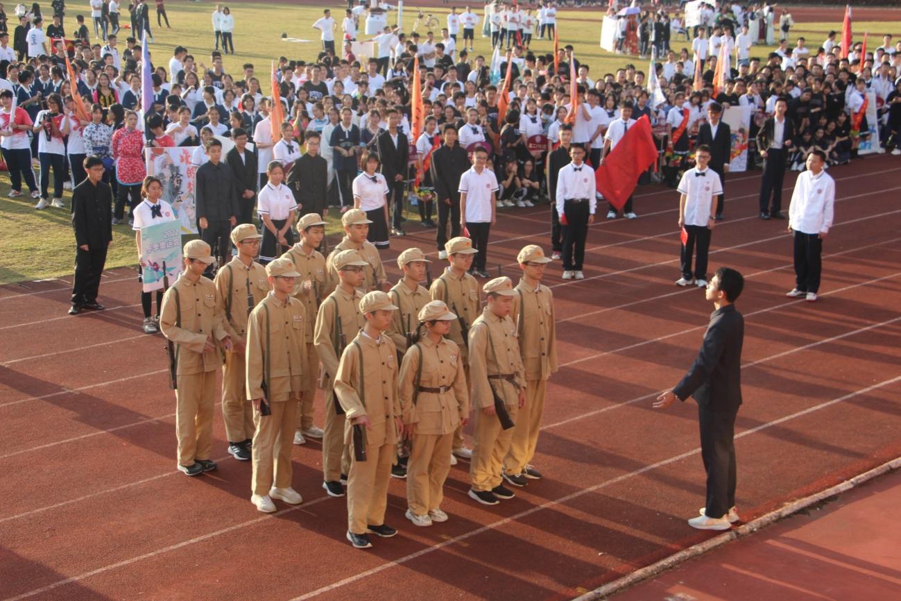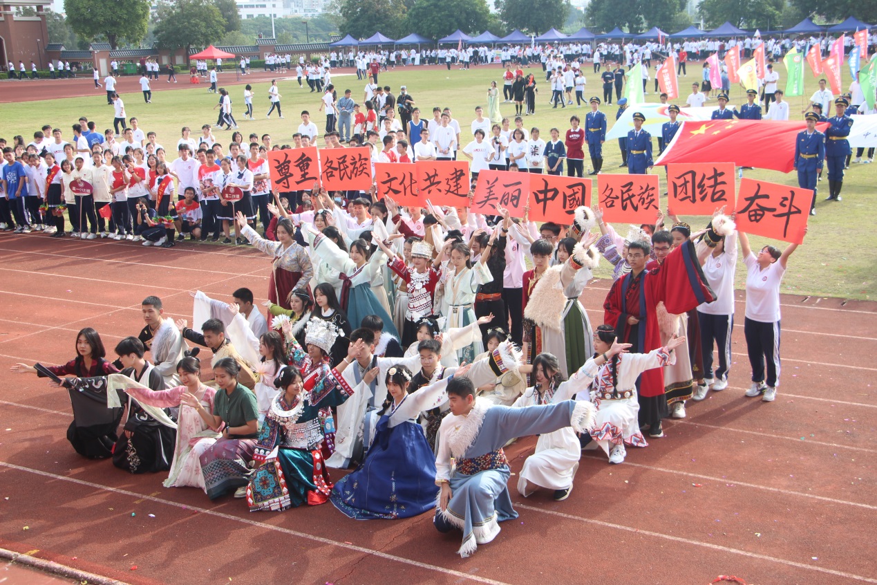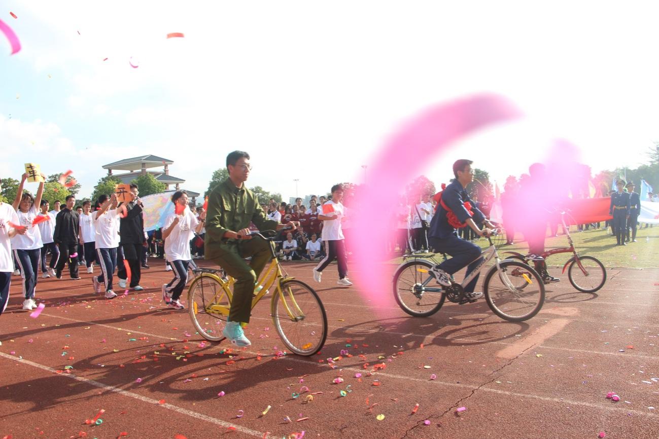 在秋日的艷陽(yáng)里,桂山田徑場(chǎng)鑼鼓喧天、彩旗飄揚(yáng)。60個(gè)班級(jí),60個(gè)方陣,各班同學(xué)用自己的方式展現(xiàn)民族特色、時(shí)代精神、中國(guó)自信,用自己的信念詮釋新時(shí)代青年的責(zé)任與擔(dān)當(dāng)。高三(5)班學(xué)生穿著復(fù)古服裝,騎著自行車,展現(xiàn)改革開放前后的不同變化。高三(17)呈現(xiàn)了農(nóng)業(yè)直播現(xiàn)象,展現(xiàn)了鄉(xiāng)村振興的繁榮景象。高二(13)班跳著不同民族的舞蹈,生動(dòng)呈現(xiàn)各民族一家親的畫面。在這里,你可以看到颯爽的舞蹈、風(fēng)趣幽默的表演以及多姿多彩的造型。