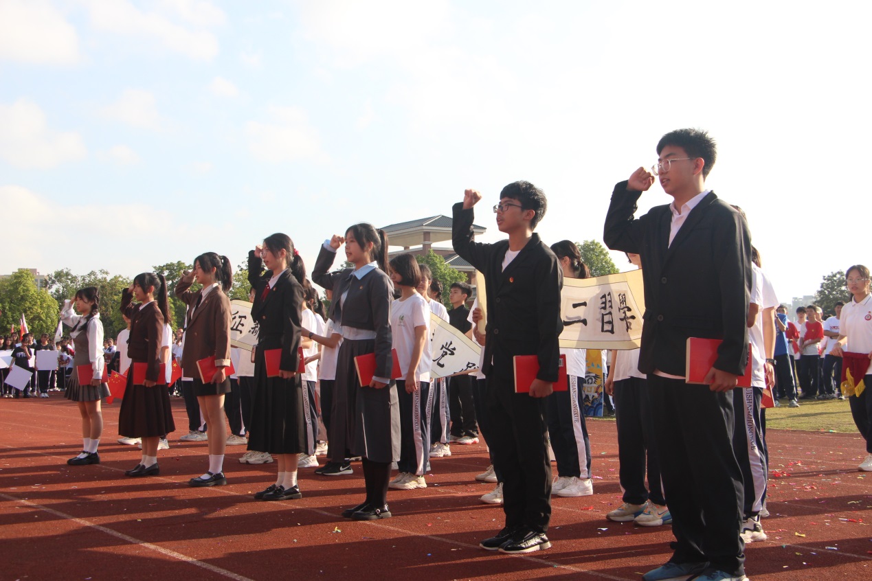 桂山中學(xué)陳福生副校長(zhǎng)為運(yùn)動(dòng)會(huì)致開幕詞,并代表學(xué)校向參與運(yùn)動(dòng)會(huì)籌備、組織、保障的體育老師和其他所有工作人員表示感謝。他強(qiáng)調(diào),黨的二十大報(bào)告提出要促進(jìn)群眾體育和競(jìng)技體育全面發(fā)展,加快建設(shè)體育強(qiáng)國(guó)。學(xué)校體育是落實(shí)“立德樹人”根本任務(wù)的重要工作,是促進(jìn)學(xué)生全面發(fā)展的重要工作。我們要以飽滿的精神狀態(tài),在賽場(chǎng)上勇敢的將自己的特長(zhǎng)展現(xiàn)出來(lái),不論面臨怎么樣的困境和難處,都要有自強(qiáng)不息、敢于拼搏、向前沖刺的勇氣。在大會(huì)中鍛煉自己的品格,強(qiáng)化自身的精神,養(yǎng)成榮辱不驚、泰然自若的大賽選手心態(tài),將自己的能力正常甚至超常地發(fā)揮出來(lái),讓青春不留遺憾。隨后,體育老師付愛錦與學(xué)生黃嘉欣分別進(jìn)行賽前宣誓,他們表示要恪守賽事活動(dòng)安排,遵守比賽規(guī)則,嚴(yán)守賽場(chǎng)紀(jì)律,以積極飽滿的熱情、認(rèn)真嚴(yán)肅的態(tài)度參與到運(yùn)動(dòng)會(huì)中。嚴(yán)小堅(jiān)副校長(zhǎng)為入場(chǎng)式中獲得一等獎(jiǎng)的班級(jí)頒獎(jiǎng)。
