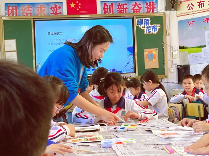 在課堂上,潘老師循循善誘。她引導(dǎo)著學(xué)生欣賞傳統(tǒng)印染工藝作品,感受印染工藝作品的對(duì)稱美與均衡美,通過了解傳統(tǒng)藍(lán)印花布的制作方法,樹立民族自信。學(xué)生在合作探究中學(xué)習(xí)十字折、輻射折、平行折等折疊方法,并嘗試創(chuàng)作出新的折疊方法;學(xué)習(xí)用點(diǎn)染、浸染等染色方法,創(chuàng)作出一副印染作品,裝飾課室,體驗(yàn)印染工藝的制作樂趣,提升孩子們的自信心。