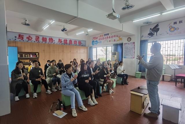 接著,兩位老師帶領(lǐng)大家進(jìn)行“柯達(dá)伊水平預(yù)備級”視唱練習(xí)。最后是豎笛吹奏學(xué)習(xí),董光維老師針對豎笛的音色、手型都進(jìn)行了細(xì)致地講解和示范。