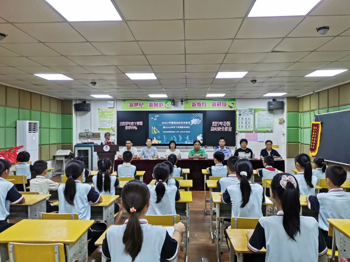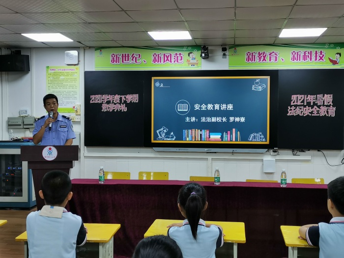 由于疫情的原因,本次散學(xué)典禮運(yùn)用校園直播系統(tǒng)進(jìn)行,主會(huì)場(chǎng)設(shè)在學(xué)校錄播室,各班教室為分會(huì)場(chǎng)。學(xué)校邀請(qǐng)了法制副校長(zhǎng)、海洲派出所副所長(zhǎng)羅神寮先生和社會(huì)熱心人士伍月寧女士出席。