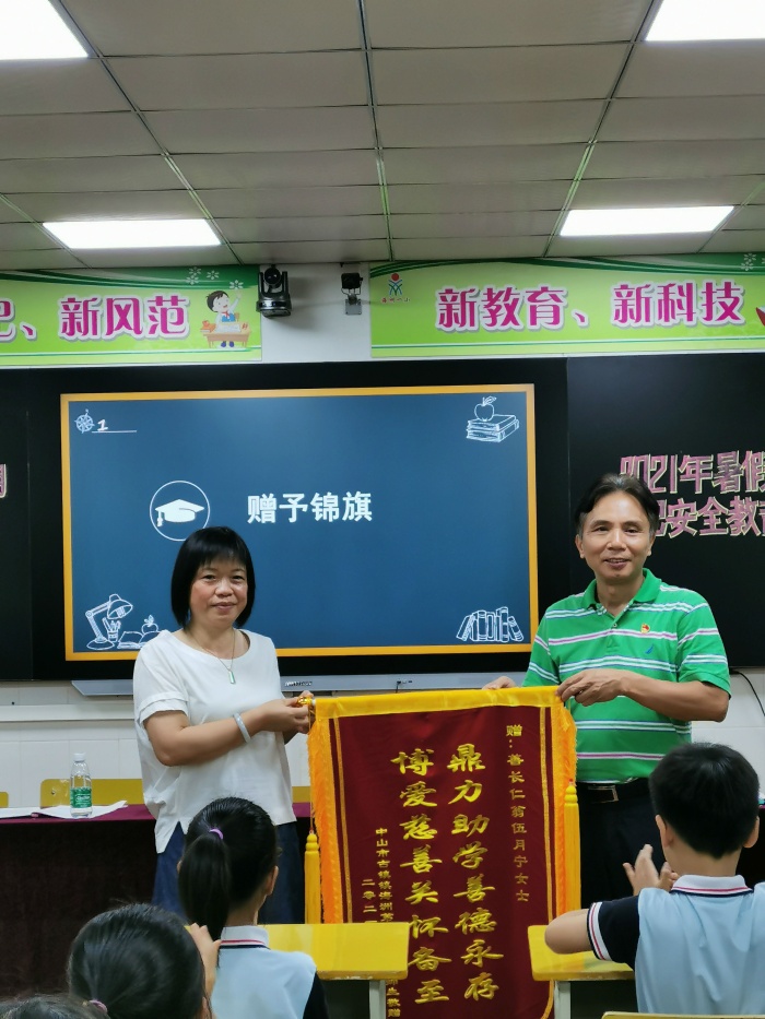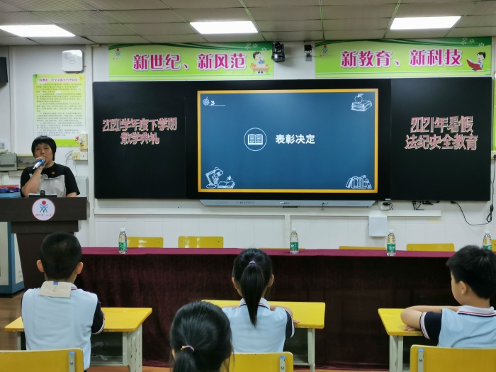 在散學(xué)典禮上,首先是學(xué)校向熱心人士對(duì)伍月寧女士贈(zèng)與學(xué)校大遮陽傘的善舉表示感謝,并給伍女士贈(zèng)與錦旗。然后是潘啟欽校長(zhǎng)給法制副校長(zhǎng)頒發(fā)聘書,對(duì)法制副校長(zhǎng)在學(xué)校的安保工作等方面作出的貢獻(xiàn)表達(dá)謝意。緊接著是法制副校長(zhǎng)作安全教育講座。講座中,法制副校長(zhǎng)從防溺水、交通安全、用電用氣、防拐防騙、綠色上網(wǎng)等學(xué)生有可能發(fā)生的安全事項(xiàng)對(duì)同學(xué)進(jìn)行了全方位的安全教育。隨后,由麥彩英副校長(zhǎng)宣讀學(xué)校的表彰決定。再由學(xué)校教導(dǎo)處趙紅月主任宣讀獲獎(jiǎng)名單并組織頒獎(jiǎng)儀式。在頒獎(jiǎng)儀式上,學(xué)校對(duì)在省、市、鎮(zhèn)獲得獎(jiǎng)勵(lì)的同學(xué)們舉行了簡(jiǎn)單的頒獎(jiǎng)儀式,對(duì)在本學(xué)期中各方面表現(xiàn)出色的同學(xué)和班級(jí)進(jìn)行表彰。此外,學(xué)校德育處主任鄧苑甜主任向全校學(xué)生布置暑假德育作業(yè)。鄧主任從生活、安全、健康、積累和實(shí)踐幾個(gè)方面向同學(xué)們布置了相關(guān)的作業(yè),重點(diǎn)希望同學(xué)們?cè)谑罴倮镆M(jìn)行黨史學(xué)習(xí),做到“從小學(xué)黨史,永遠(yuǎn)跟黨走?!弊詈?,潘校長(zhǎng)對(duì)本次散學(xué)典禮進(jìn)行總結(jié)發(fā)言,要求全體同學(xué)在假期務(wù)必注意各方面的安全,過一個(gè)充實(shí)、有意義的暑假。