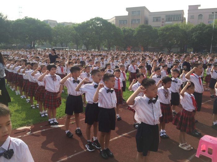 上午8時,各年級學生邁著整齊的步伐,有序進入田徑場。在莊嚴的國歌聲中,鮮艷的五星紅旗緩緩升起。全體學生目光炯炯,向國旗敬隊禮。隨后,全體師生齊唱國歌,寬闊的田徑場回響著整齊嘹亮的歌聲,師生們的心充滿了感動。