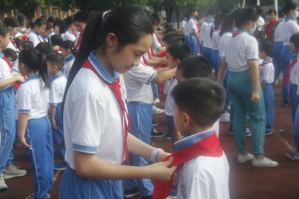 活動開始,出旗手和護(hù)旗手邁著矯健的步伐,精神昂揚(yáng)地走過升旗臺,在響亮的出旗曲中,儀式正式拉開了帷幕。出旗完畢,全體少先隊(duì)員精神飽滿,眼神堅(jiān)定,高唱齊唱《中國少年先鋒隊(duì)隊(duì)歌》。接著,由低年級大隊(duì)輔導(dǎo)員卞琦老師宣布新入隊(duì)的隊(duì)員名單,此次入隊(duì)每個(gè)班級選出了14名品學(xué)兼優(yōu)的好少年優(yōu)先入隊(duì),共計(jì)112名新隊(duì)員。所有新隊(duì)員們站得筆直,接受這份屬于自己的榮譽(yù)。接下來就是激動人心的授紅領(lǐng)巾環(huán)節(jié)。六年級的老隊(duì)員們手捧鮮艷的紅領(lǐng)巾整齊地走到一年級的新隊(duì)員面前為新隊(duì)員們佩戴好紅領(lǐng)巾。在《紅領(lǐng)巾飄起來》的背景音樂中,老隊(duì)員和新隊(duì)員互敬隊(duì)禮,仿佛完成了一場使命的傳承。所有新隊(duì)員佩戴好紅領(lǐng)巾后,總輔導(dǎo)員劉姝鶯副主任帶領(lǐng)新隊(duì)員們進(jìn)行宣誓。在隊(duì)旗下,所有新隊(duì)員緊握右拳,莊嚴(yán)宣誓:為共產(chǎn)主義事業(yè)貢獻(xiàn)力量!宣誓完畢,由德育林德歡副校長分別為所有新建立的中隊(duì)以及中隊(duì)輔導(dǎo)員授予隊(duì)旗和聘書。