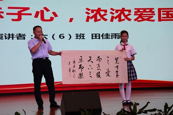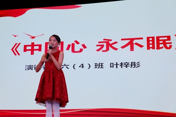 本次比賽由朱漢釗同學(xué)主持,7名年級家委和老師共同擔(dān)任評委。共有7名選手參賽,選手們以《志存高遠(yuǎn),少年強國》《中國心,永不眠》國歌情懷等為主題。比賽中,每位選手激情昂揚,自信滿滿,他們用自己真摯的情感、激昂的文字,贊美了中國人民在抗擊新冠疫情中同心協(xié)力、共渡難關(guān)的偉大壯舉,歌頌了偉大祖國的日新月異和繁榮富強,暢談了在祖國母親的哺育下茁壯成長的感受,抒發(fā)了少年兒童對偉大祖國的無限熱愛,表達(dá)了自己為祖國美好的明天而努力奮斗的愿望。除此之外,7位參賽選手的家人也來到了現(xiàn)場為自己的孩子加油鼓氣。他們或揮毫潑墨,或深情朗誦,或用歌聲去傳遞那份濃濃的愛。隨后,六年級師生同臺朗誦《我們愛你啊,祖國》,表達(dá)純真的愛國情懷。而大合唱國歌和《我和我的祖國》更是把現(xiàn)場氣氛推向了高潮。師生們、家委們揮動著自己手中的小紅旗,用歌聲去贊美祖國。整個會場洋溢著濃濃的愛國情。