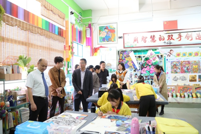 第四個環(huán)節(jié)由評估小組分組查閱資料,巡視校園并進行實地考察,前往美術室、書法室、榕創(chuàng)室等參觀學生們現(xiàn)場繪畫、紙漿畫制作、書法揮毫、STEM教育成果展示等,輔導老師詳細介紹活動開展情況,評估組老師還親自體驗科技作品的應用。