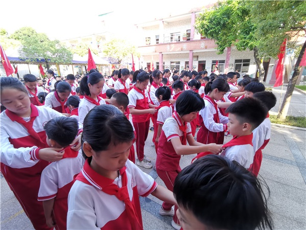 隊(duì)歌唱罷,大隊(duì)輔導(dǎo)員梁老師宣讀新隊(duì)員入隊(duì)名單后,新隊(duì)員在四位輔導(dǎo)員的帶領(lǐng)下有序進(jìn)場(chǎng),五六年級(jí)的老隊(duì)員代表們?yōu)樾玛?duì)員們戴上了鮮艷的紅領(lǐng)巾。這一刻,新隊(duì)員的心中仿佛都浪濤翻滾,感到無比神圣和自豪。是的,紅領(lǐng)巾是光榮的代表,戴上紅領(lǐng)巾,心中就有了信念,有了希望,有了前行的方向和力量。緊接著,由大隊(duì)輔導(dǎo)員帶領(lǐng)新隊(duì)員在隊(duì)旗下宣誓,洪亮的宣誓聲久久回蕩在校園的上空。