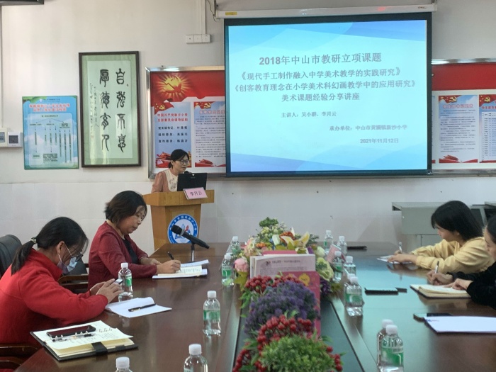 為進一步提升美術(shù)教師科研水平和教學(xué)能力,加強科研和教學(xué)經(jīng)驗交流、促進教育教學(xué)水平的提高,總結(jié)推廣新沙小學(xué)2018中山市教育科研立項課題《創(chuàng)客教育理念在小學(xué)美術(shù)科幻畫中的應(yīng)用研究》研究經(jīng)驗與成果,引領(lǐng)課題研究活動科學(xué)、規(guī)范開展。2021年11月12日下午,黃圃鎮(zhèn)美術(shù)教研活動“美術(shù)課題經(jīng)驗分享講座”在新沙小學(xué)舉行,課題主持人李月云老師作為主講人。黃圃鎮(zhèn)教育和體育事務(wù)中心藝術(shù)專干杜晗婷老師以及黃圃鎮(zhèn)中小學(xué)美術(shù)教師參加本次活動。