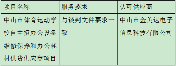 中山市體育運(yùn)動(dòng)學(xué)校于2022年6月2日就中山市體育運(yùn)動(dòng)學(xué)校自主招辦公設(shè)備維修保養(yǎng)和辦公耗材供貨供應(yīng)商項(xiàng)目(項(xiàng)目編號(hào):ZSTXFW202204)采用自主采購(gòu)方式進(jìn)行采購(gòu),現(xiàn)就本次采購(gòu)成交結(jié)果公布如下:
