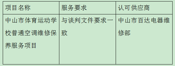 中山市體育運(yùn)動(dòng)學(xué)校于2022年4月29日就中山市體育運(yùn)動(dòng)學(xué)校普通空調(diào)維修保養(yǎng)服務(wù)項(xiàng)目(項(xiàng)目編號(hào):ZSTXHT202202)采用自主采購(gòu)方式進(jìn)行采購(gòu),現(xiàn)就本次采購(gòu)成交結(jié)果公布如下: