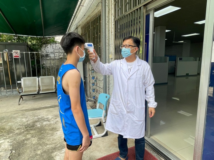 演練開始,教練模擬在日常測體溫中發(fā)現(xiàn)一名體溫異常且伴有發(fā)燒癥狀的運(yùn)動(dòng)員,隨即教練將發(fā)熱學(xué)生帶往校醫(yī)務(wù)室。校醫(yī)重測體溫,并詢問學(xué)生的流行病學(xué)史,發(fā)現(xiàn)學(xué)生有流行病學(xué)史后,將其帶往隔離室留觀,迅速上報(bào)學(xué)校分管領(lǐng)導(dǎo)黃中興,分管領(lǐng)導(dǎo)上報(bào)校長室,立即啟動(dòng)新冠肺炎疫情應(yīng)急處置方案。全程演練緊張有序,各部門分工明確、配合默契、行動(dòng)迅速,達(dá)成了預(yù)期的目標(biāo)。