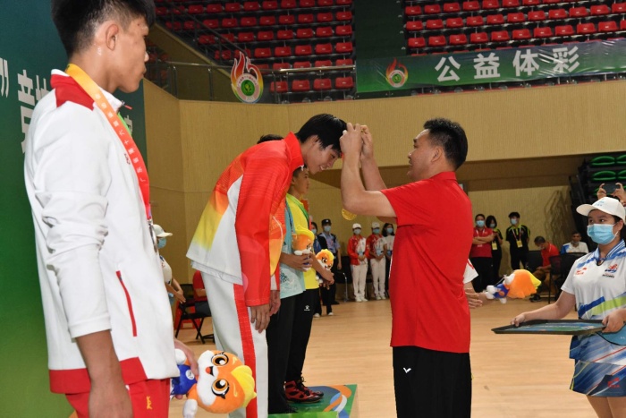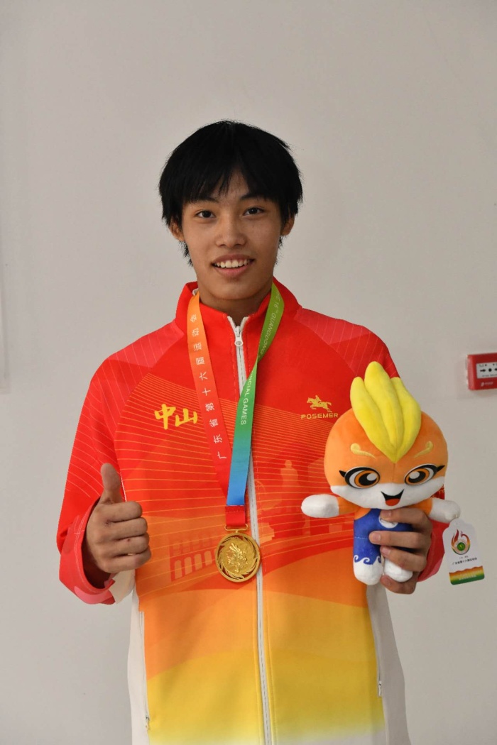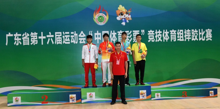 這是韋海龍首次參加省運會比賽,他的內(nèi)心充滿了對冠軍的渴望。在前兩日的比賽中,隊友們連奪兩金,這既是對他最大的鼓勵,但同時也給他帶來了巨大的心理壓力?!靶睦韷毫νΥ蟮?,總是想著比賽的事情。但教練說過的‘把訓(xùn)練當(dāng)比賽,把比賽當(dāng)訓(xùn)練’,讓我卸下了思想包袱,心里踏實了許多?!表f海龍賽后談到了此次比賽的感受。但令他意想不到的是,自己會以如此懸殊的比分把人生的首個省運會冠軍收入囊中。賽后,現(xiàn)場觀賽的中山市教體局陳威副局長為冠軍得主韋海龍頒發(fā)金牌。