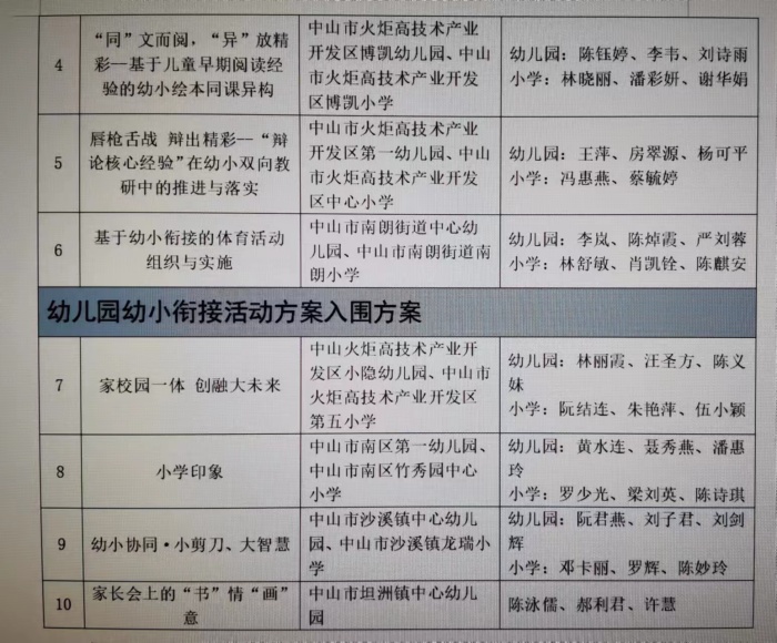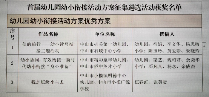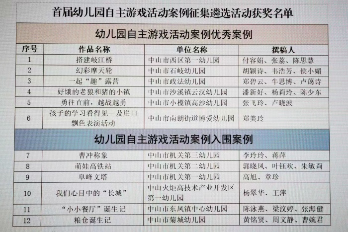 2023年5月5日,在廣東省教育廳公布的《廣東省首屆幼兒園自主游戲活動案例和幼小銜接活動方案征集遴選結果》中,中山市有12個自主游戲活動案例和10個幼小銜接案例榜上有名。據(jù)了解,全省共遴選出自主游戲活動優(yōu)秀案例86篇,入圍案例138篇;幼小銜接活動優(yōu)秀方案80篇,入圍方案145篇。中山市此次選送自主游戲活動案例15個,其中6個獲評優(yōu)秀案例,6個獲評入圍案例;選送幼小銜接活動方案15個,其中6個獲評優(yōu)秀方案,4個獲評入圍方案(獲獎名單見附件)。