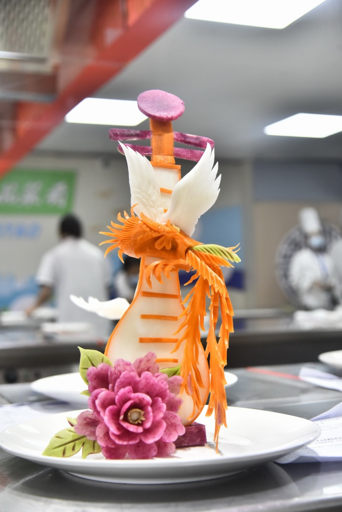 比賽凸顯職教特色,為省內各中職學校之間專業(yè)建設提供交流與成果檢驗的平臺。烹飪賽項由理論和實操兩大項目組成,實操項目分為四個模塊:粵菜制作、廣點制作、主題拼盤和食品雕刻,主要考察選手對粵菜、廣點基本功的知識和技能掌握程度。模塊一:粵菜制作,參賽選手在 115 分鐘內完成五彩炒雞絲、骨香鴿片和自選作品制作;模塊二:廣點制作,參賽選手在 150分鐘內完成提褶包、嶺南酥皮作品(烤制)和自選作品的制作;模塊三:主題拼盤制作,參賽選手在63分鐘內完成剞切蓑衣黃瓜和自選作品的制作;模塊四:食品雕刻,參賽選手需要在67 分鐘完成基本功作品月季花和自選作品的制作。自選作品需符合地方粵菜飲食文化特色和烹飪技法特點,展示選手技術創(chuàng)新和學以致用方面的技巧與能力。