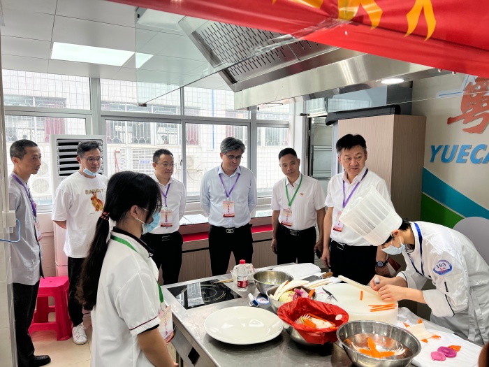 為保障大賽的順利舉行,市現代職業(yè)技術學校高度重視,會同上級主管部門、企業(yè)、行業(yè)專家多次召開工作推進會。學校共組織培訓學生志愿者180余名,教師志愿者90余名,確保各個環(huán)節(jié)的服務工作全覆蓋、高質量,為參賽選手提供1對1服務。賽場開展現場網絡直播,營造“公平、公正、公開”的競賽氛圍,同時弘揚了粵菜文化。比賽期間,廣東省教育廳大賽辦覃忠健與大賽督察梁海波巡視賽場比賽情況,充分肯定學校的協辦工作。