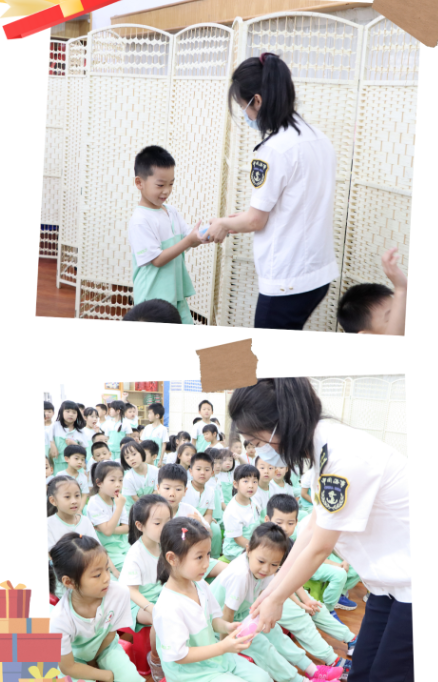 活動最后,中山海事局給幼兒園贈送《中山市水上安全應(yīng)急手冊》,讓孩子們通過閱讀了解更多的水上安全知識。作為感謝,孩子們也給叔叔、阿姨送上自制的海洋、船舶徽章。