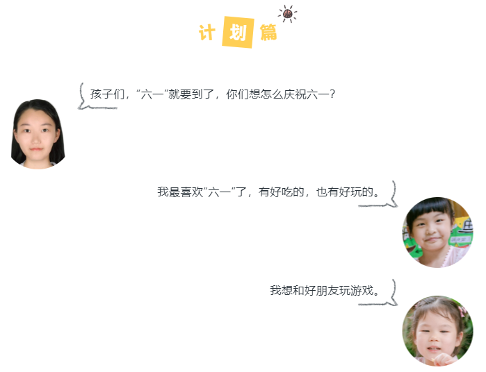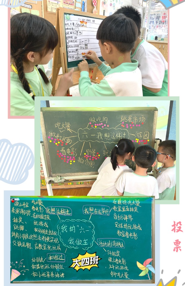 我們對(duì)“六一”這一天充滿期待和好奇……可是到底怎樣過節(jié)?和誰一起過節(jié)?我們有自己的想法!我們迫不及待地用畫筆記錄下自己的想法并和小伙伴分享。最后,經(jīng)過投票,我們選出最期待的游園、大食會(huì)和觀看電影活動(dòng)。