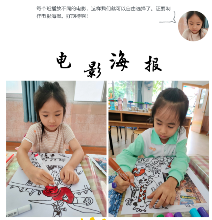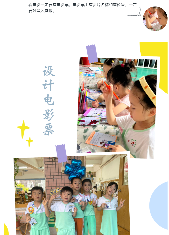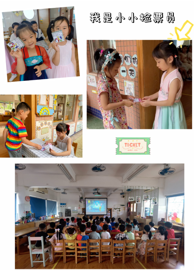 時(shí)光電影院開場啦!每個(gè)教室變身溫馨的電影放映廳,放映著不同的電影。拿上電影票,帶上小零食趕緊進(jìn)場吧。