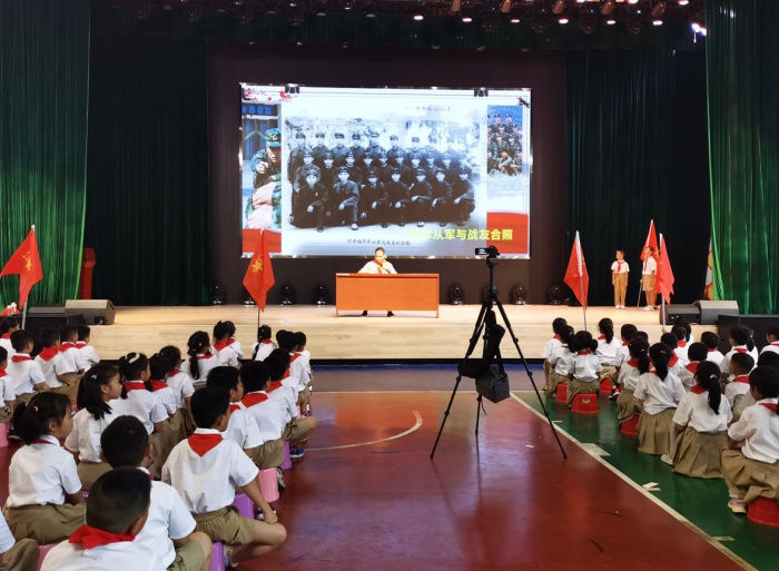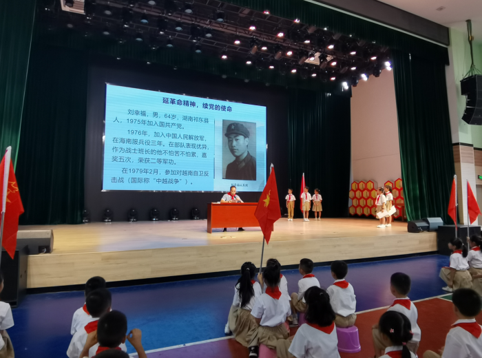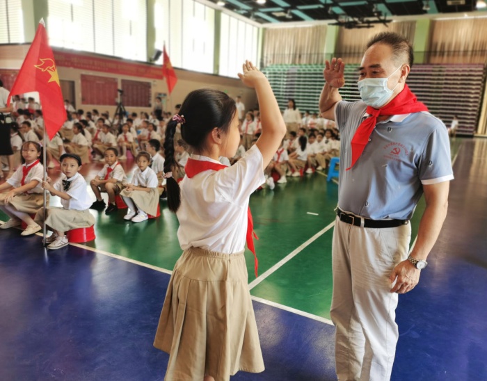 當(dāng)劉幸福同志來到隊員們中間,隊員們激動地為其戴上了紅領(lǐng)巾,并以最崇高的隊禮向劉爺爺表示致敬。劉幸福同志向少先隊員們講述了當(dāng)年那個炮火硝煙的年代,解放軍戰(zhàn)士舍小家為大家,義無反顧投奔戰(zhàn)場最前線,紛紛向黨組織申請到最艱難最危險的地方去。劉幸福同志表示,作為一名共產(chǎn)黨員,要不斷秉持為民初心,堅持道路自信,永葆奮斗意志和姿態(tài),為祖國第二個百年奮斗目標(biāo),繼續(xù)貢獻自己的一份力量!劉幸福同志激情昂揚的話語深深感染了現(xiàn)場的每一名師生,掌聲久久回蕩在會場中。最后,劉幸福同志寄語八小少先隊員們,要珍惜如今的幸福生活,刻苦學(xué)習(xí)文化知識,努力鍛煉身體,積極參加校內(nèi)外各種公益活動,成長為擔(dān)當(dāng)民族復(fù)興大任的時代新人。