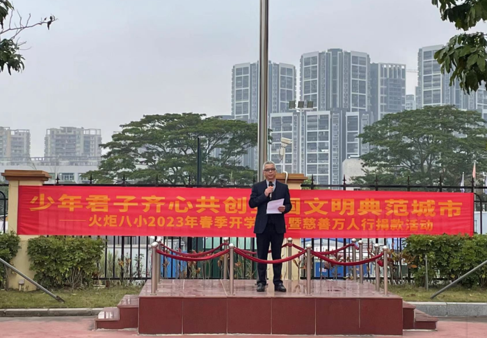 新的學(xué)期,新的開始。開學(xué)典禮上,董偉文副校長向全校師生發(fā)出“共創(chuàng)全國文明典范城市 把中山建設(shè)得更加美麗”的倡議,號召全體師生崇德尚善,熱心公益,為爭創(chuàng)全國文明典范城市、建設(shè)美麗中山增光添彩!董校長鏗鏘有力的話語點燃了師生們的熱情,在熱烈的氛圍中,火炬八小慈善萬人行捐款活動也拉開了帷幕。老師和孩子們紛紛走向捐款箱,為中山慈善事業(yè)貢獻一份力量。