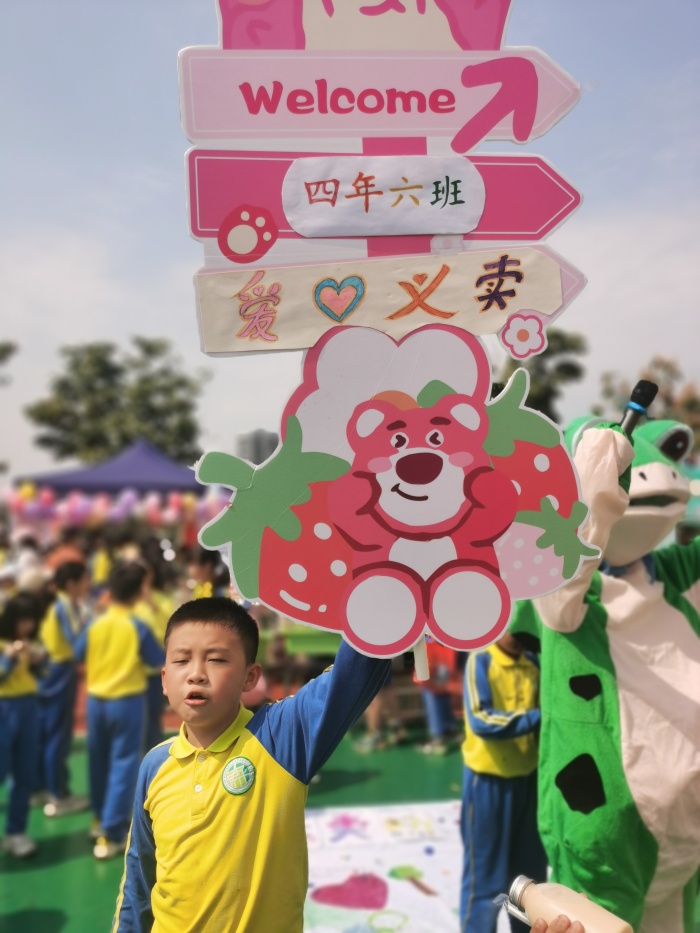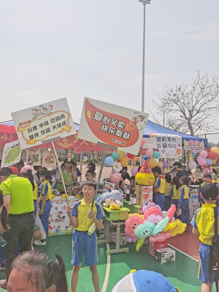 義賣活動(dòng)熱火朝天的開(kāi)展起來(lái),各個(gè)攤位陸續(xù)傳來(lái)了同學(xué)們賣力的吆喝聲,他們化身售貨員、推銷員、收款員......向前來(lái)購(gòu)買的同學(xué)、老師用心推薦書(shū)籍、文具、美食。為了吸引更多買家,同學(xué)們集思廣益,在攤位旁邊開(kāi)展刮刮樂(lè)抽獎(jiǎng)、套圈等刺激消費(fèi)的活動(dòng),當(dāng)買家猶豫不決時(shí),這些“小小商家”還會(huì)果斷推出買一送一的優(yōu)惠活動(dòng),將可愛(ài)的小禮品送到顧客手上。家長(zhǎng)們?yōu)榱苏袛堫櫩鸵彩钩隽藴喩斫鈹?shù):有的身著玩偶熱舞不斷;有的自備音響高聲歡唱;有的甚至把一些彈珠游戲機(jī)帶進(jìn)校園......小小的籃球場(chǎng)上,拎著一袋袋戰(zhàn)果的買家們笑了,拿著錢準(zhǔn)備放進(jìn)捐贈(zèng)箱中的賣家也笑了。