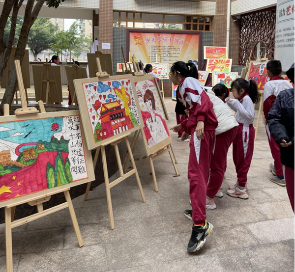 展覽中的每幅作品都是同學(xué)們的精心創(chuàng)作,用五彩畫筆來傳承并發(fā)揚(yáng)紅色文化,以豐富多彩的畫面表達(dá)對黨的崇敬與祝福。一幅幅“紅色”的繪畫作品在桂馨園展出,駐足其間,讓人心曠神怡,紅色基因也悄無聲息的根植于孩子們心中。