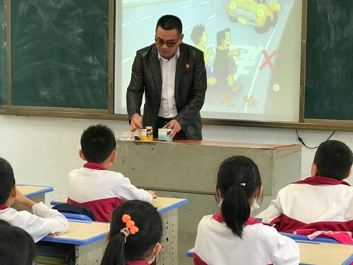為開發(fā)區(qū)第一小學(xué)四5班學(xué)生演繹這一節(jié)生命課堂的是中山市交通安全文化傳播公益宣講聯(lián)盟講師、中山國丹中醫(yī)院副院長易金平。根據(jù)學(xué)生的年齡特點,易老師以極受少年兒童敬仰的“警察”引出“交警”,并讓學(xué)生即席表達對“交警”的所知所聞。當話題轉(zhuǎn)入交警的主要職責(zé)時,易老師結(jié)合畫面比較溫和的卡通圖片,逐一擊破道路上的虎口狼穴,逐一曝光其中的安全隱患。