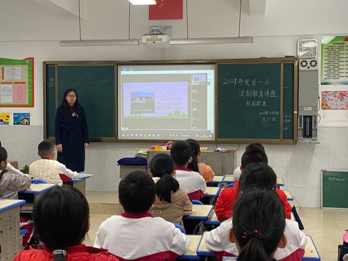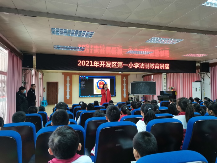 為了進(jìn)一步提高廣大學(xué)生的安全與法律意識,預(yù)防校園欺凌事件的發(fā)生,營造和諧的校園環(huán)境,2021年12月27日,開發(fā)區(qū)第一小學(xué)舉行了法制教育講座,全校40個班級參加此次講座,活動由開發(fā)區(qū)第一小學(xué)梁玉珊主任主持,學(xué)校邀請了校園民警肖友良警官主講此次講座。全程采用現(xiàn)場直播的形式,活動共分為兩個會場,六年級有4個班在綜合電教室主會場,其他36個班在教室分會場。