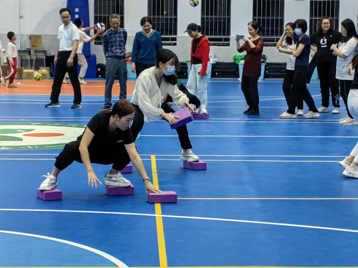 本次競賽活動由杜金龍老師主持。杜老師首先詳細(xì)地宣布活動規(guī)則,然后以 “教練說”和“老師做”的小游戲點燃了活動的氛圍。“杜老師說”活動口令,老師們聚精會神地聽口令,做動作,既緊張又有趣!